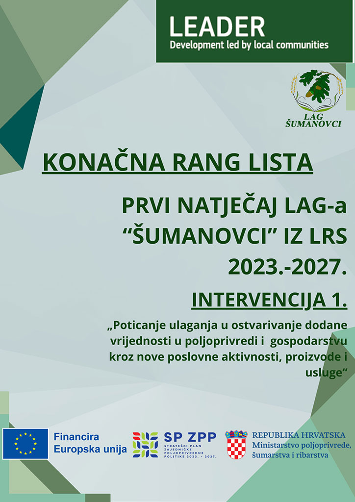Upravni odbor LAG-a "Šumanovci" je na svojoj 12. sjednici održanoj 08. travnja 2026. godine, donio Odluke o odabiru projekata za 22 projekta prijavljena na 1. LAG Natječaj za provedbu Intervencije 1. "Poticanje ulaganja u ostvarivanje dodane vrijednosti u poljoprivredi i gospodarstvu kroz nove poslovne aktivnosti, proizvode i usluge". Ukupan iznos dodijeljene potpore putem ovog Natječaja iznosi 772 730,30 EUR.